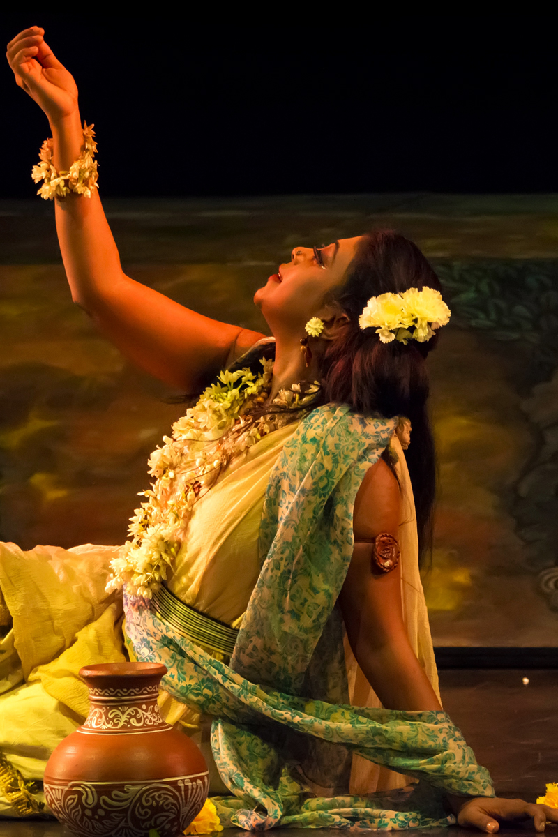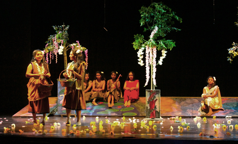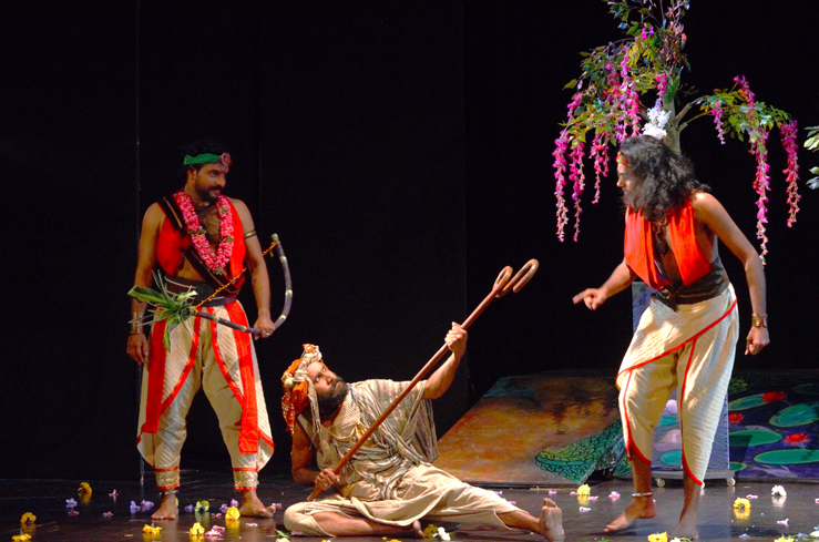 Shaakuntalam is an eco-feminist adaptation of the Sanskrit classic by Kalidasa. The whole process of this production shaakuntalam was initiated from the query, why Shaakuntalam now? The performance takes a leap from the torturous summer of the present day to the tranquil summer as depicted by Kalidasa. This drama Shaakuntalam probes the plot with an eco-feministic sensibility and hence the story of the signet ring, the curse of Durvasa, and the reunion in Acts 6 and 7 are deemphasized so as to highlight the relationship between Shakuntala and Dushyanta. The hunt itself becomes a metaphor with myriad connotations. The king hunts into the serene Ashram which is all blushed with flowering creepers, the vana jyotsna, latha nikunj, deer, birds, lotuses, water bodies, cool wind, flower beds, and the music from the rustling leaves… A perfect set for love and unison, as typical, dreamlike, and poetic as in any of the Kalidasa literature. To this throbbing and reverberating sensuousness, hunts in Dushyanta on a chariot that can affect and de-harmonize the serenity and peace of the hamlet, with his arrows of flower and a bow of sugar cane… Shakuntala and her friends are as innocent and pristine as nature. Dushyanta is none other than Kamadev embodied, assisted by his aides with the ability to sensualize the innocence of the feminine essence with the arrows of flowers. Dushyanta bitten by the heat of love lingers back in the lush greenery of the forest trying all his wits and craft, embodying and recreating the honeybee, elephant, and the Rakshasas as a pretext to save Shakuntala and hence succeeds in courting her in a Gandharva marriage, eventually to forget her. Dushyanta is a ‘lover’ with many women in his life and as his friend Vidushaka points out, after eating all the ripe fruits of the city, he is eying at the ‘imli’ (Tamarind) in Shakuntala. The relationship between Shakuntala and Dushyanta is used as a parable to understand the continuing falsehood of love that focuses on the body of the female rather than true man-woman understanding and mutual inclusion. In the end, Shakuntala is forced to call Dushyanta ‘Anarya’ when love subsides into recognition of reality. Subtle references to racial constructs, rural/tribal conflicts, essence and meaning of ‘culture’, sophistication, etc. are interwoven as the subplots in the narration. The words and lines written by Kalidasa are acquiring a new meaning and are able to resonate deeper connotations in this re-reading of the text. This performance text is counter writing of the play on stage, without admiring or negating the text written by Kalidasa. Towards the end of the play Shaakuntalam, Dushyanta declares in an ephemeral, scanty, and derisory explosion of histrionics that he remembers Shakuntala and offers the ring back to her, which she graciously rejects saying that she does not believe in that ring anymore. She is taken by nature/birds in a dreamlike serenity of independence and comradery of fellow women. The play at another level is a visual translation of the poetry of Kalidasa using paintings, properties, lighting, music, and movement, making the performance a visual delight with an underscore of pain and separation. The atmosphere, art, music, movement, and ethnic ethos represent a pahadi culture that is in contrast to that of the urban; the performance body trying to alienate from the usual renditions of the classic.